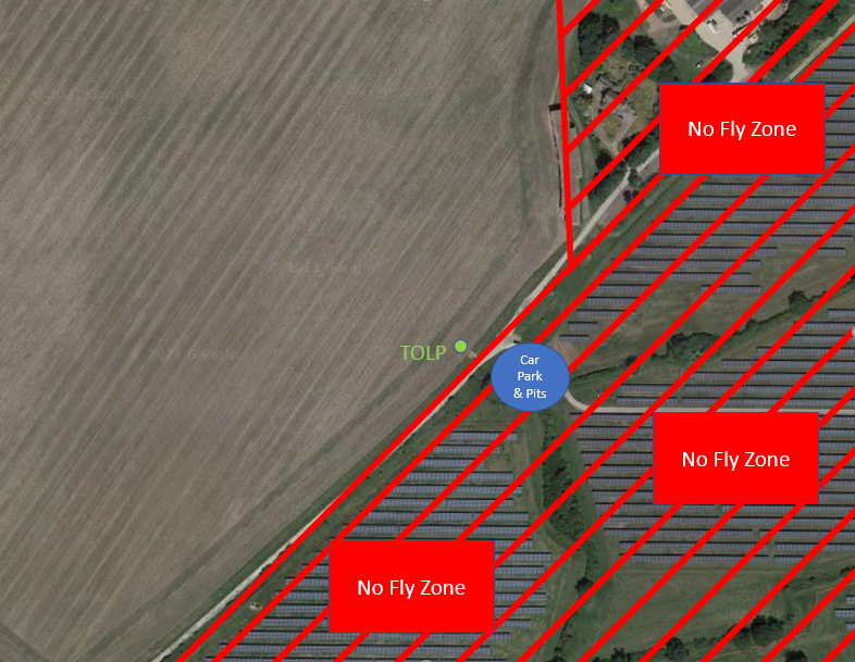 Please park vehicles in the vicinity of the circle shown in the diagram on the opposite side of the bridleway from the flight line. All vehicles are left entirely at their owners’ risk. Under no circumstances should models be started in the pits area.